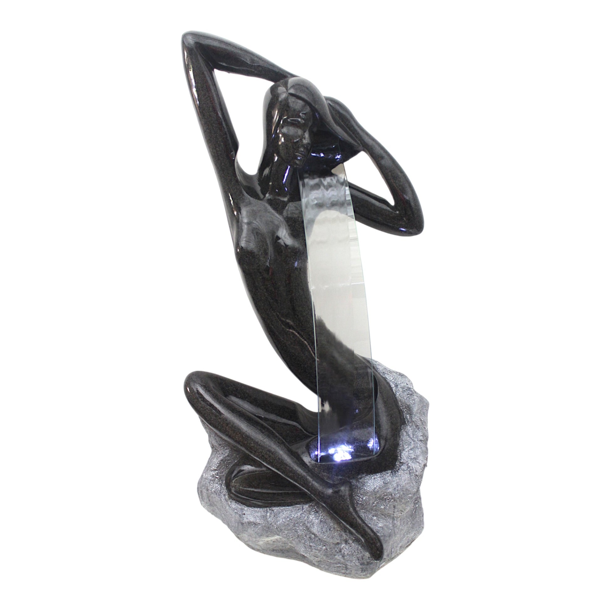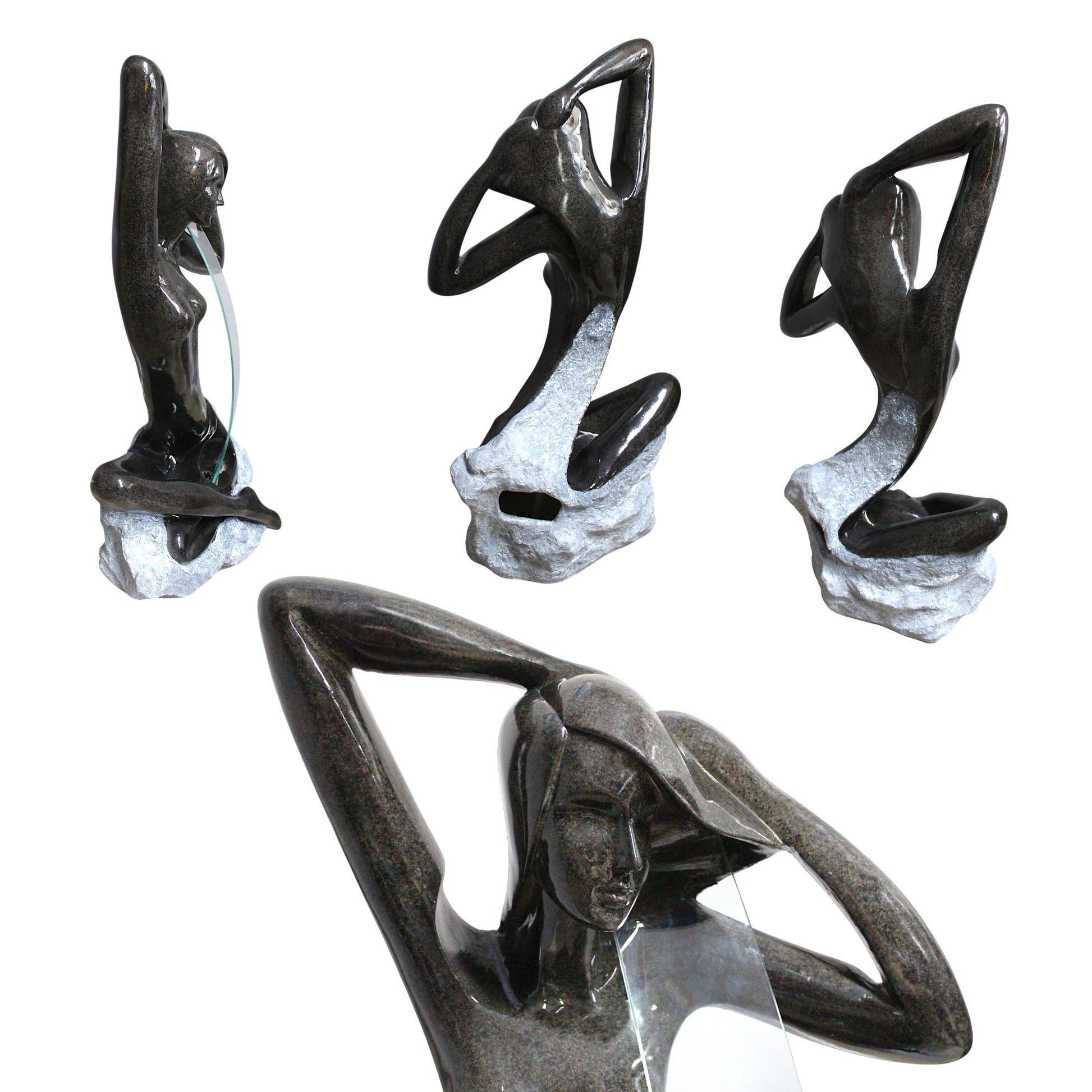 Dieser exklusive Design-Springbrunnen verbindet kunstvolle Ästhetik mit naturgetreuer Steinoptik und hochwertiger Technik. Die elegante Frauenfigur ist vollständig aus Polyresin gefertigt und in einem Stück gegossen. Ihre polierte Oberfläche zeigt einen leicht glänzenden Look, der an dunkel geschliffenen Granit erinnert – weich glänzend, edel und absolut authentisch. Der massive Sockel bildet dazu einen spannenden Kontrast: rau, grob und wie ein natürlicher Granitfelsen modelliert.