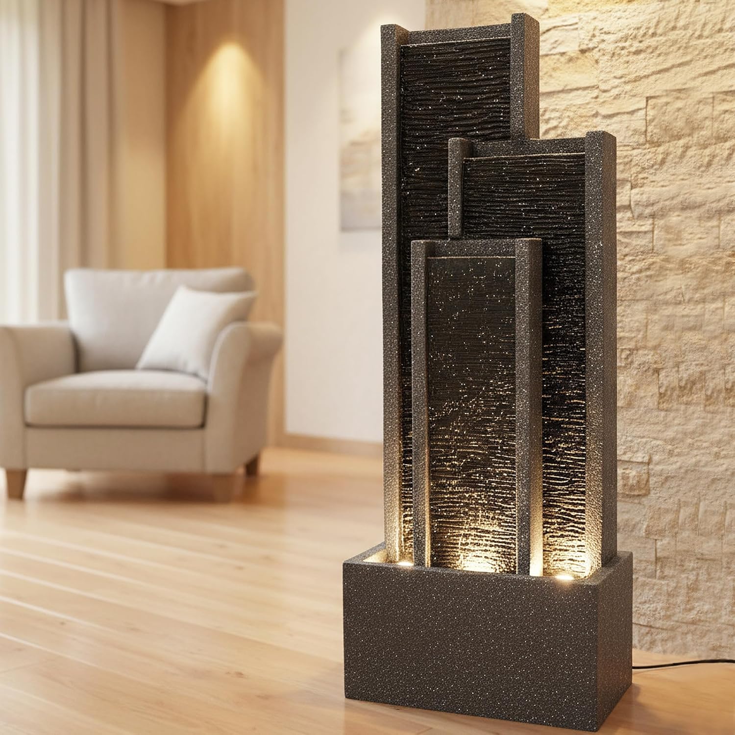 Dieser eleganteGartenbrunnen in Schiefer-Optik ist eine besondere Gartendekoration für Ihr Zuhause. Das beliebte Design einer Wasserwand wird bei diesem Modell mit gleich 3 Wasserfall-Kaskaden geboten.