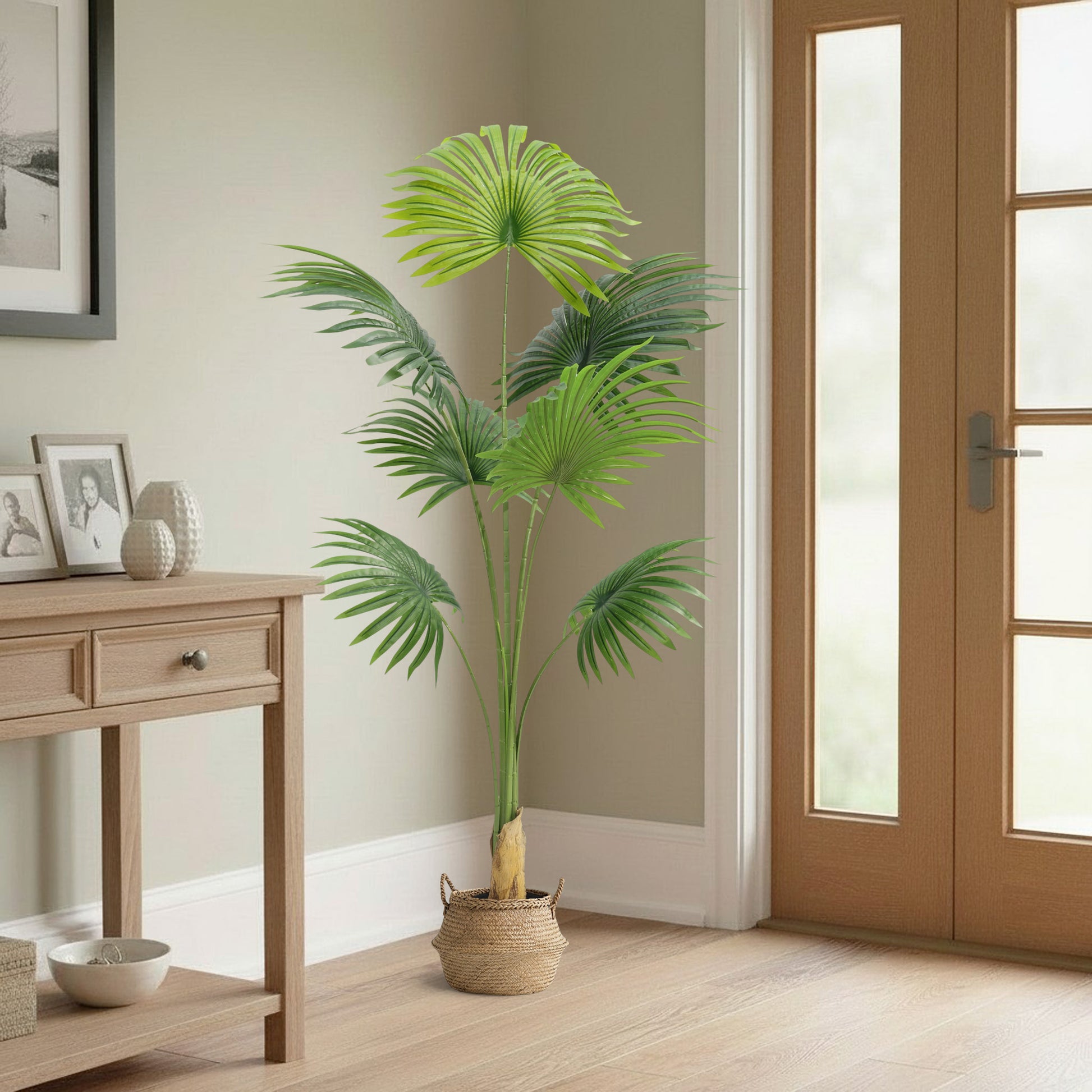 Die Fächerblätter überzeugen durch ihre natürliche Form, sanfte Farbverläufe und eine realistische Blattstruktur. Unterschiedlich ausgerichtete Wedel sorgen für Tiefe und Volumen, sodass die Palme aus jedem Blickwinkel lebendig wirkt. Je nach Ausrichtung erreicht sie einen Durchmesser von ca. 70 cm und lässt sich individuell in Szene setzen.