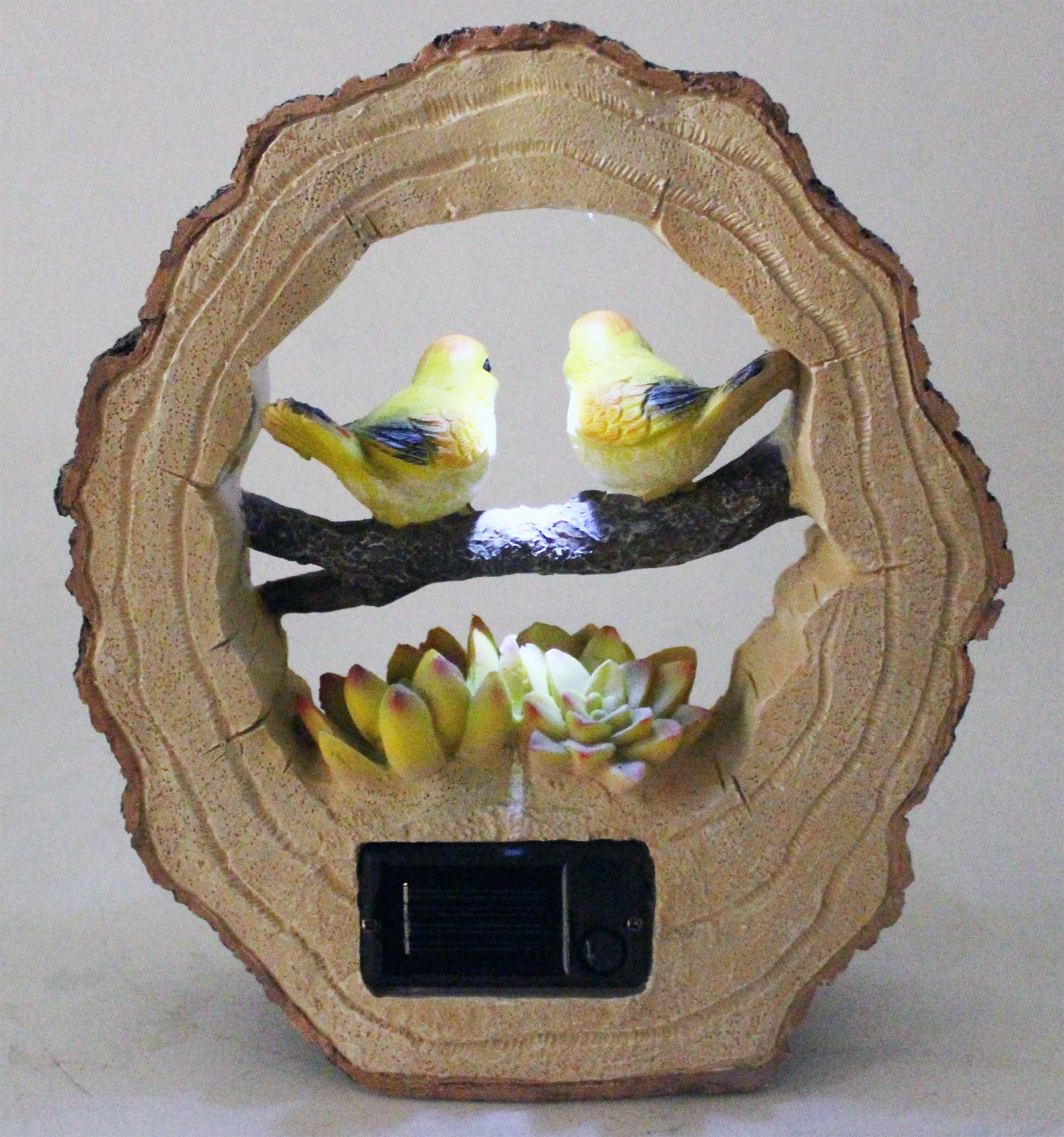 Von oben werden die zwei Vögel von einem LED Spot angestrahlt, damit auch bei Dunkelheit diese schöne Gartenfigur in Szene gesetzt wird.