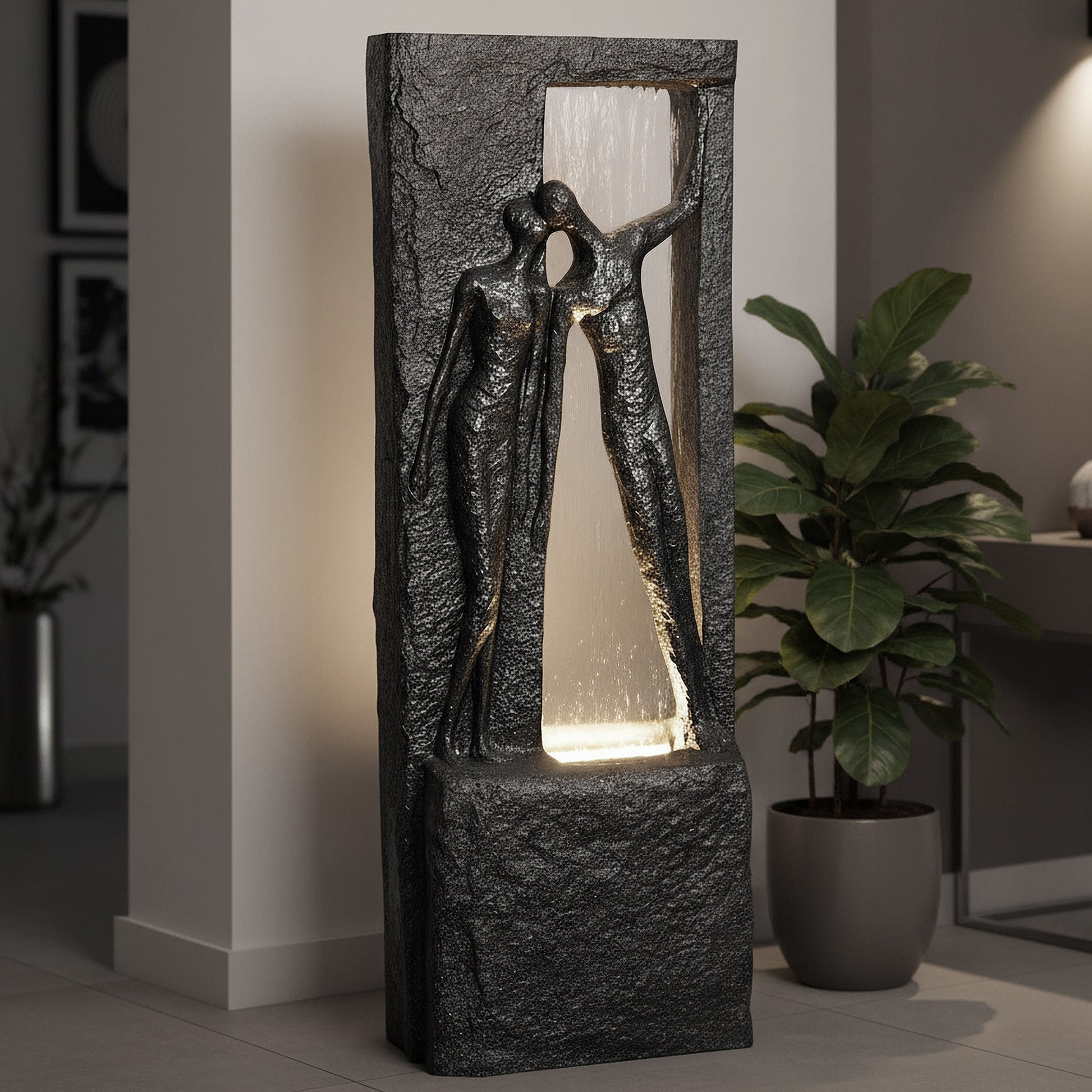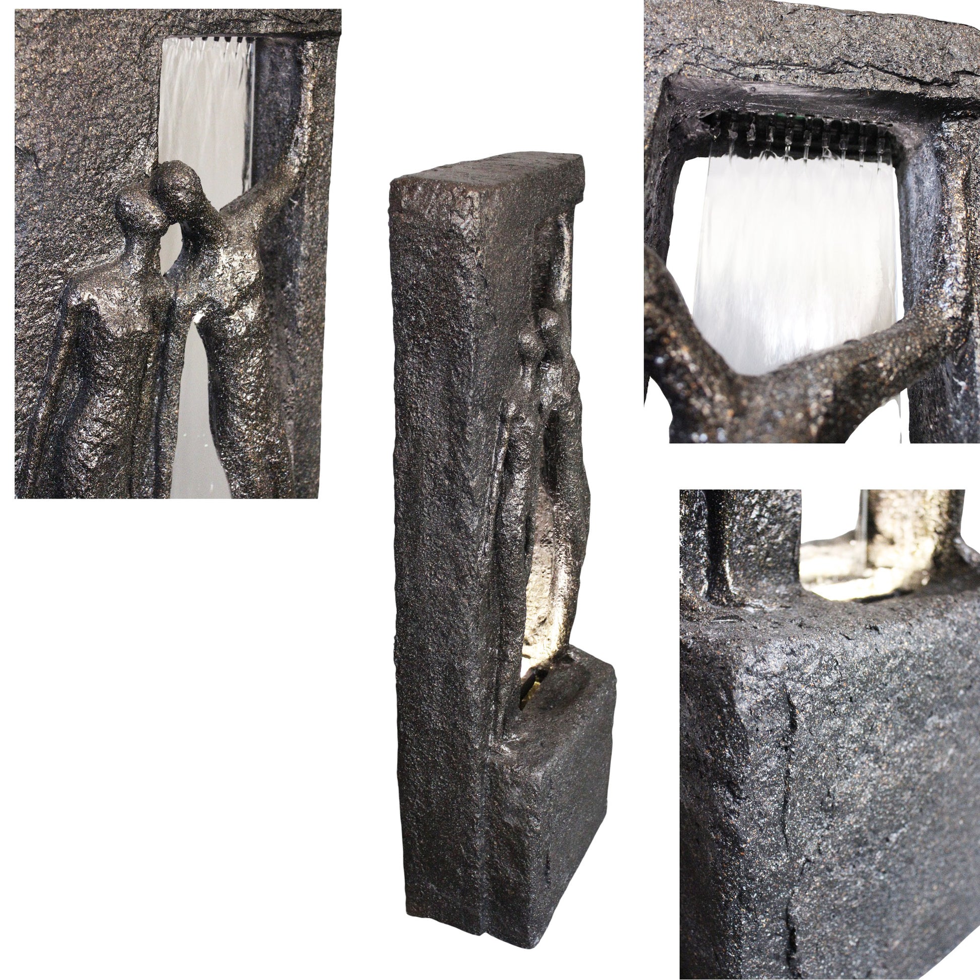 Die Skulptur in moderner Bronze-Steinoptik (eine dunkle, steinartige Oberfläche mit edlem bronzenem Schimmer) verleiht dem Brunnen eine künstlerische Note und macht ihn zu einem dekorativen Highlight für jeden Innen- und Außenbereich.