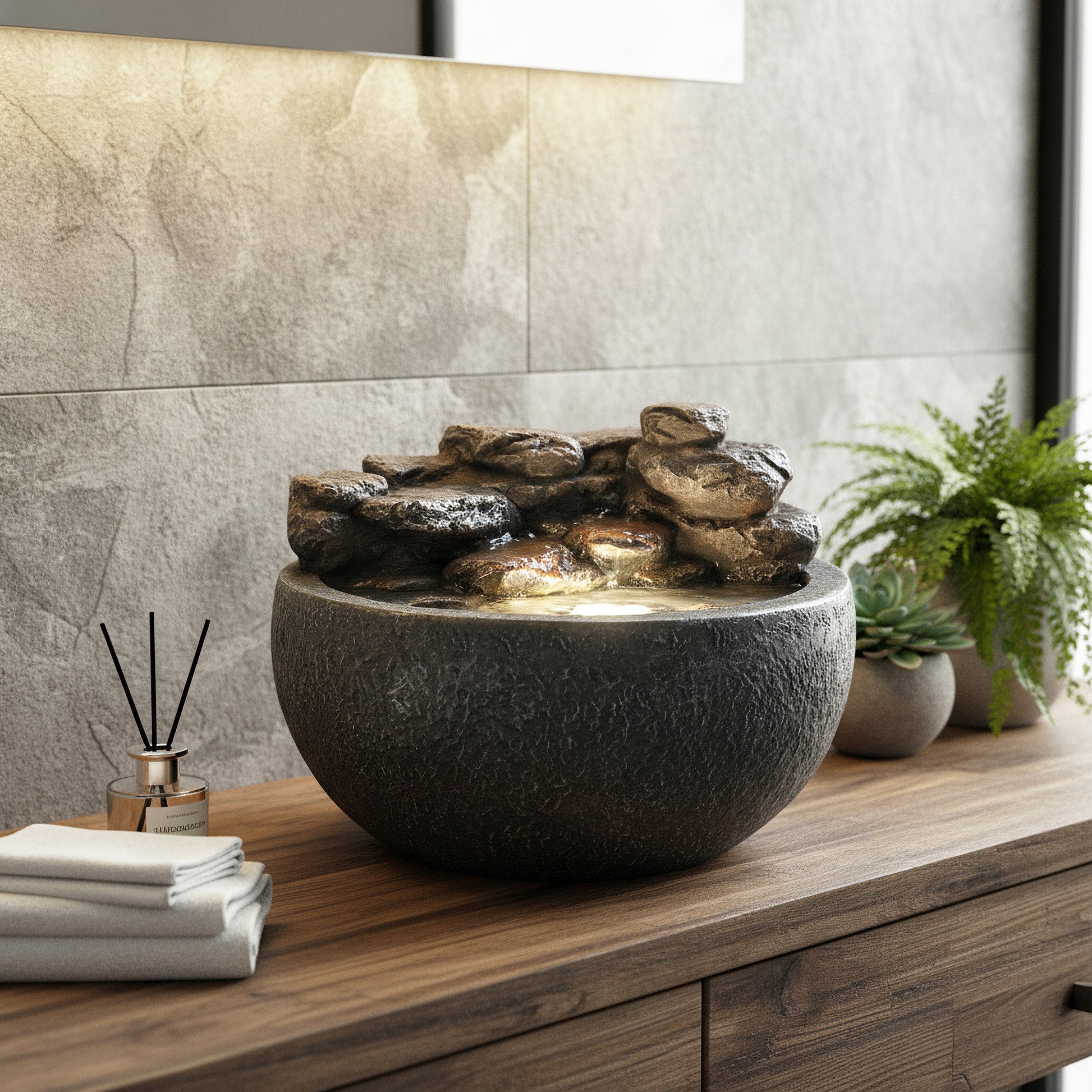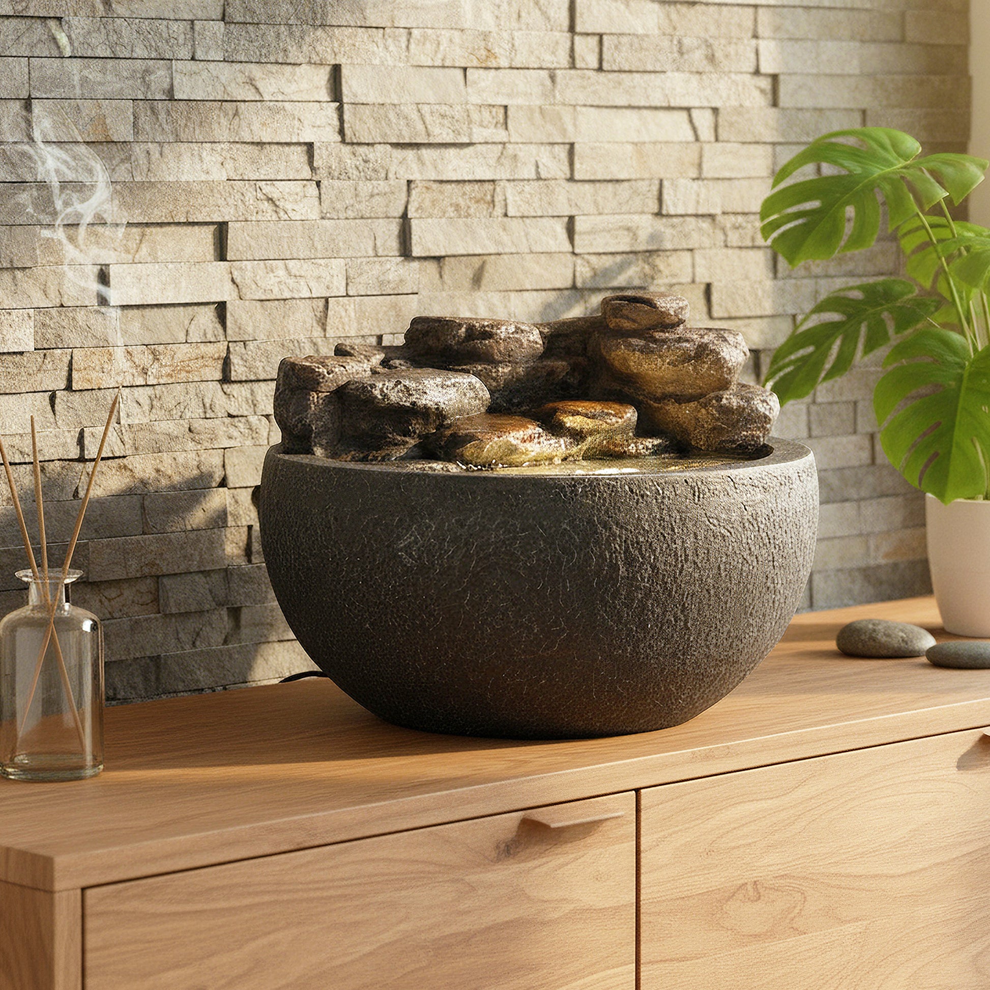 Im Inneren des Wasserbeckens sorgt eine warmweiße LED-Beleuchtung für ein sanftes, edles Lichtspiel. Das Wasser wird effektvoll angestrahlt und schafft – ob auf der Terrasse, im Wohnzimmer oder auf dem Sideboard – eine ruhige und entspannende Atmosphäre.