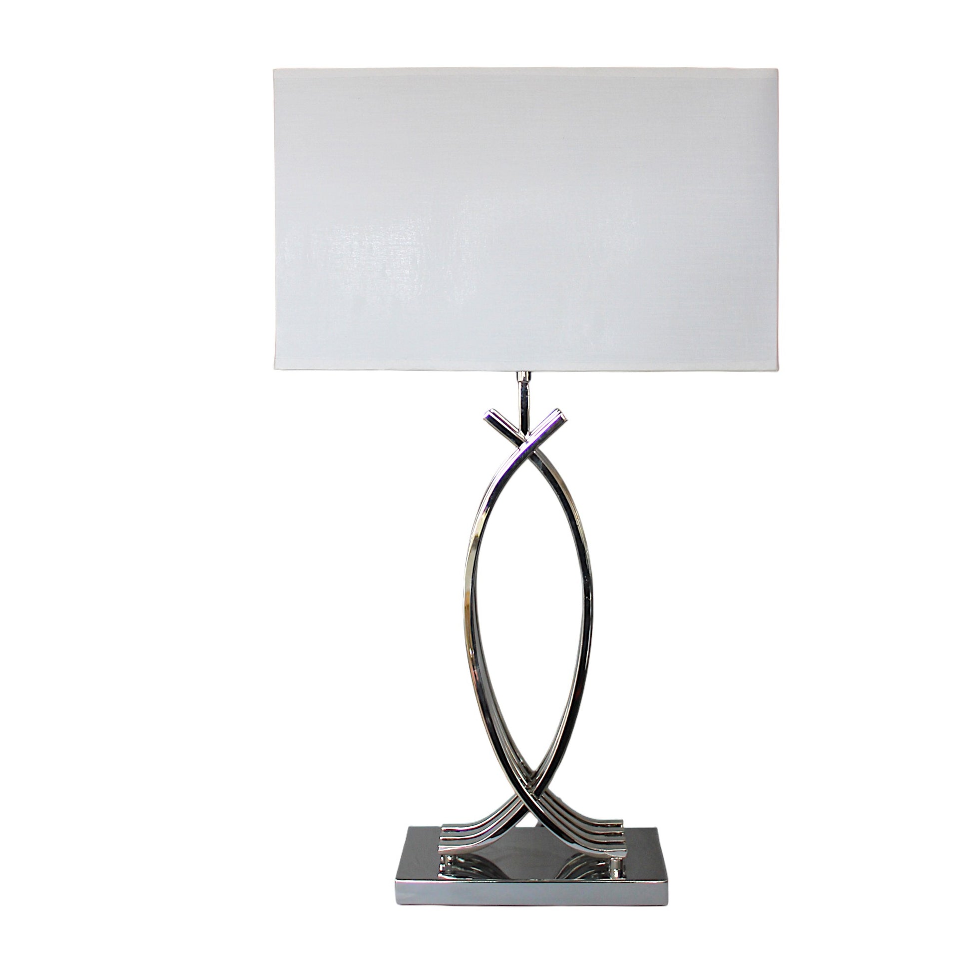 Diese elegante Tischlampe in extragroßem Format setzt stilvolle Akzente in jedem Wohnraum. Der hochwertige weiße Stoffschirm sorgt für eine angenehm weiche Lichtverteilung, während der außergewöhnliche verchromte Lampenfuß mit seiner geschwungenen Linienführung zum echten Design-Highlight wird.