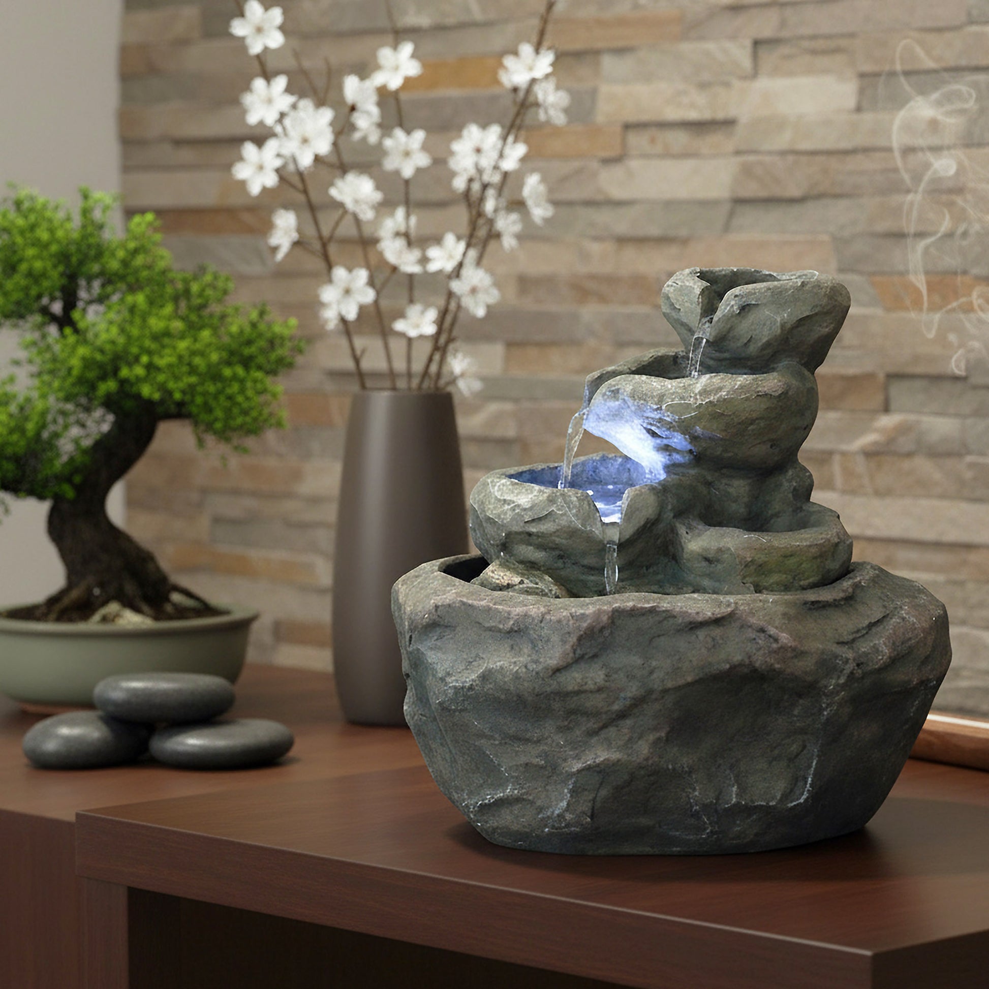Im zweiten Becken von oben befindet sich eine kalt-weiße LED, die das herabfließende Wasser stimmungsvoll beleuchtet. Bei Dunkelheit entsteht ein wunderschönes Lichtspiel, das den kleinen Wasserfall zum Highlight jeder Einrichtung macht. Perfekt für harmonische Abende und ein angenehmes Raumgefühl.