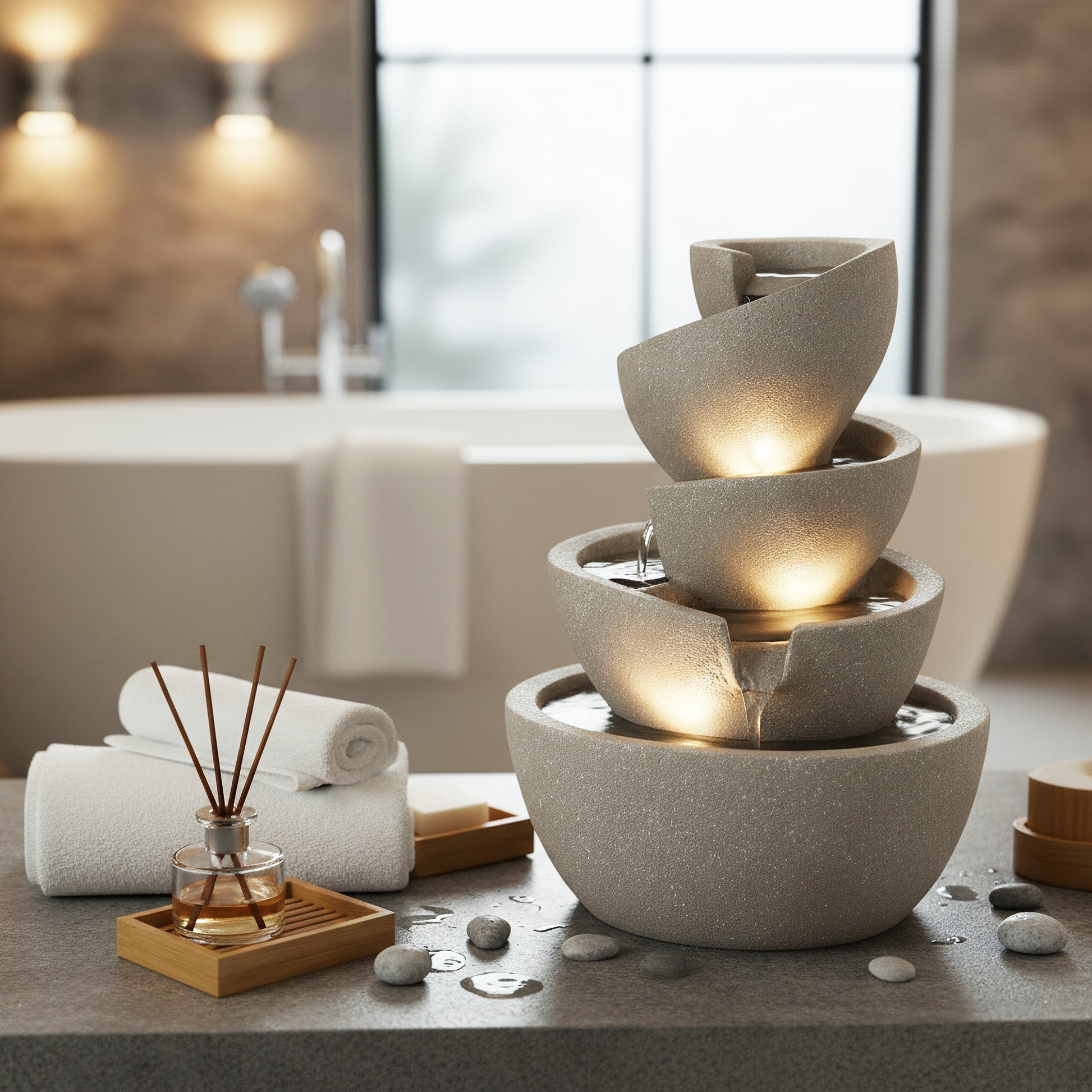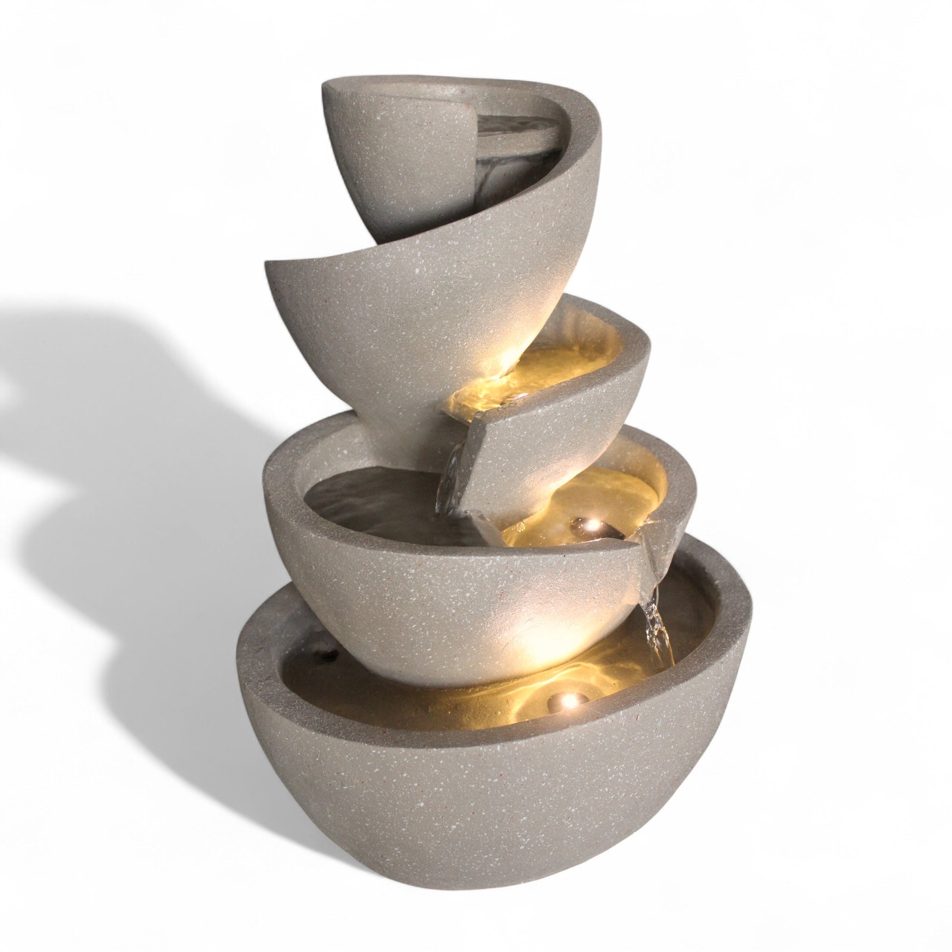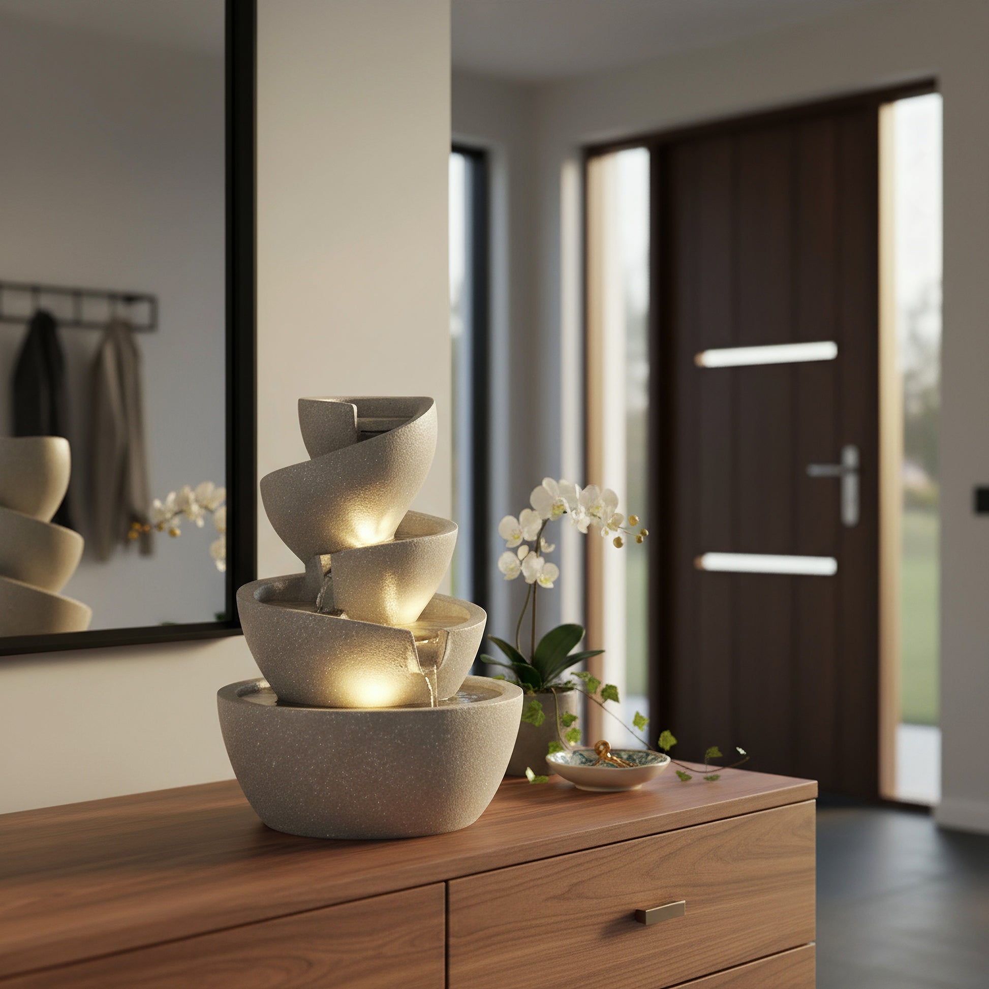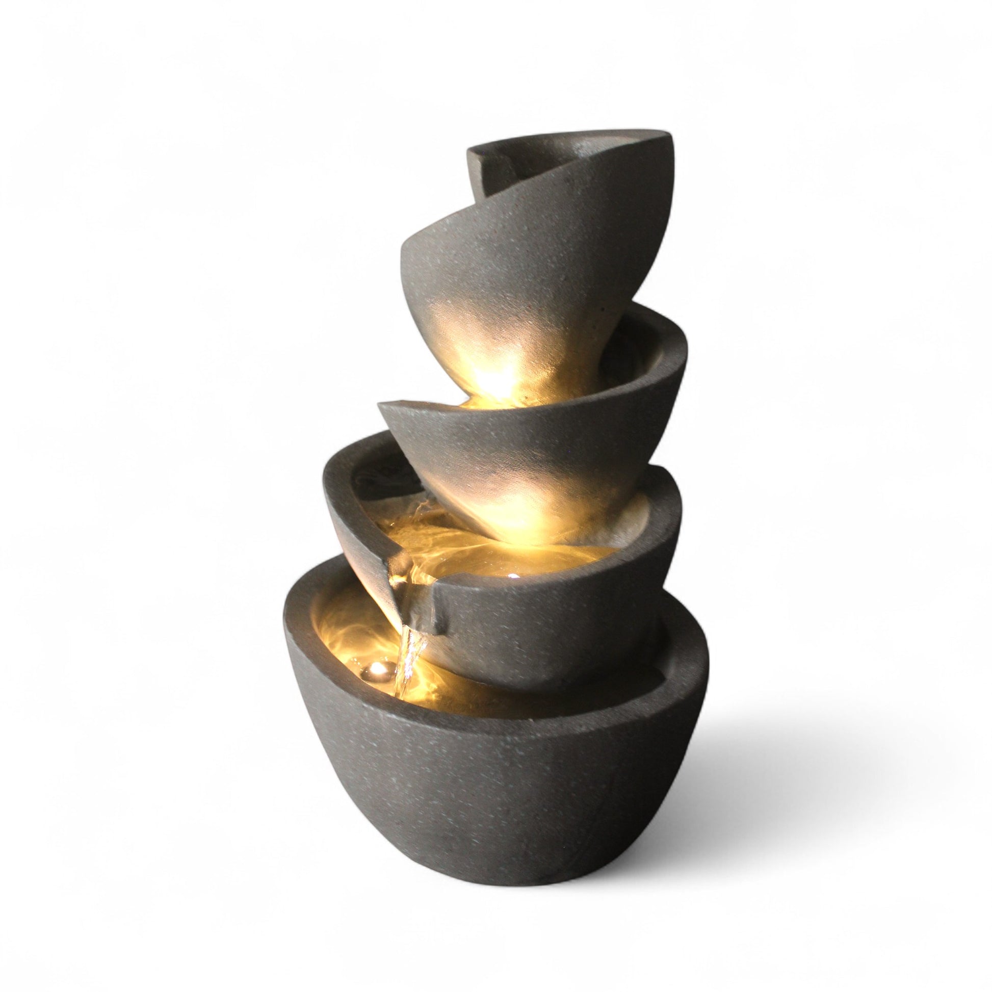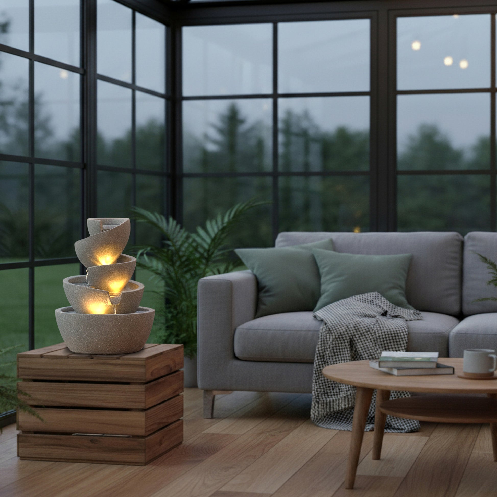 Der dekorative Zimmerbrunnen BK912 überzeugt durch seine moderne Form aus vier elegant ineinander fließenden Schalen, die das Wasser sanft von Ebene zu Ebene leiten. Drei warmweiße LED-Spots setzen das fließende Wasser stimmungsvoll in Szene und schaffen ein beruhigendes Lichtspiel – ideal für Wohnzimmer, Büro, Wintergarten oder Eingangsbereich. Auch für den Außenbereich geeignet.