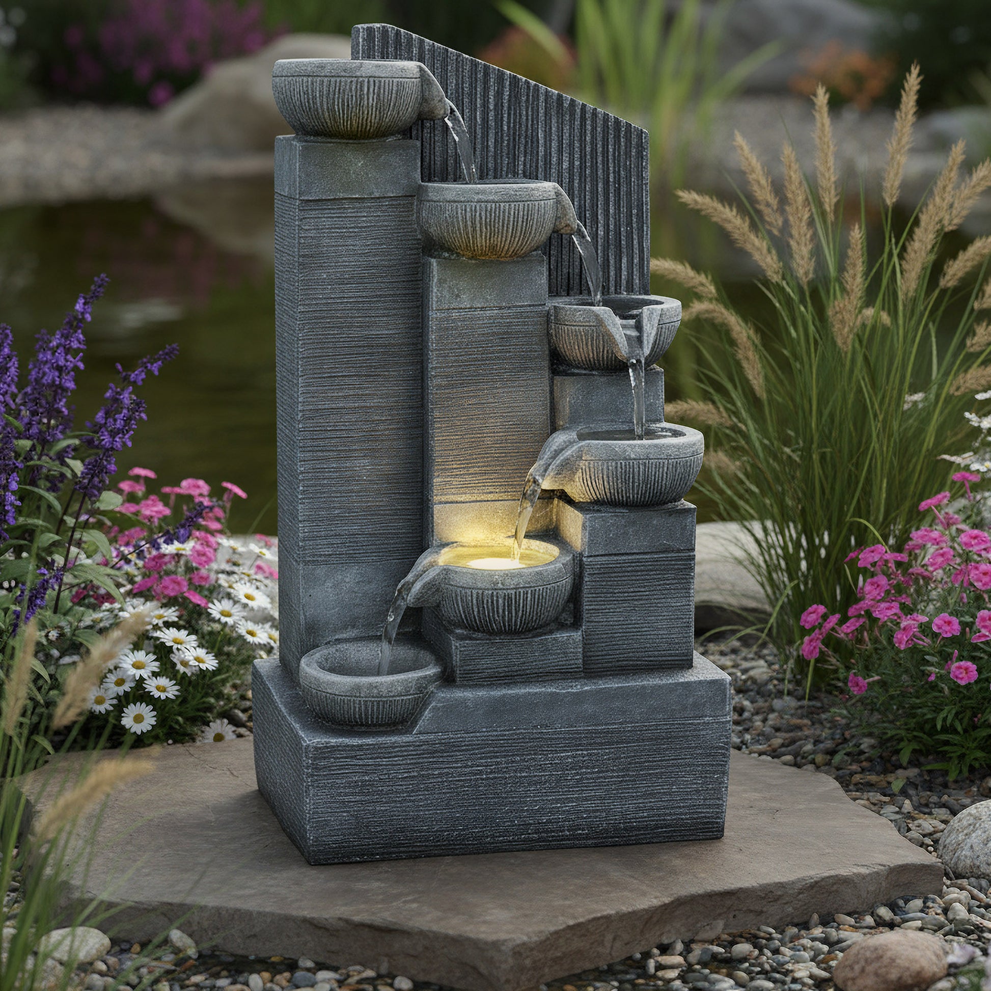 Die untere Mittel-Schale ist mit einem warmweißen LED-Spot ausgestattet, der den Brunnen bei Dunkelheit in ein stimmungsvolles Licht taucht und ein faszinierendes Lichtspiel erzeugt.