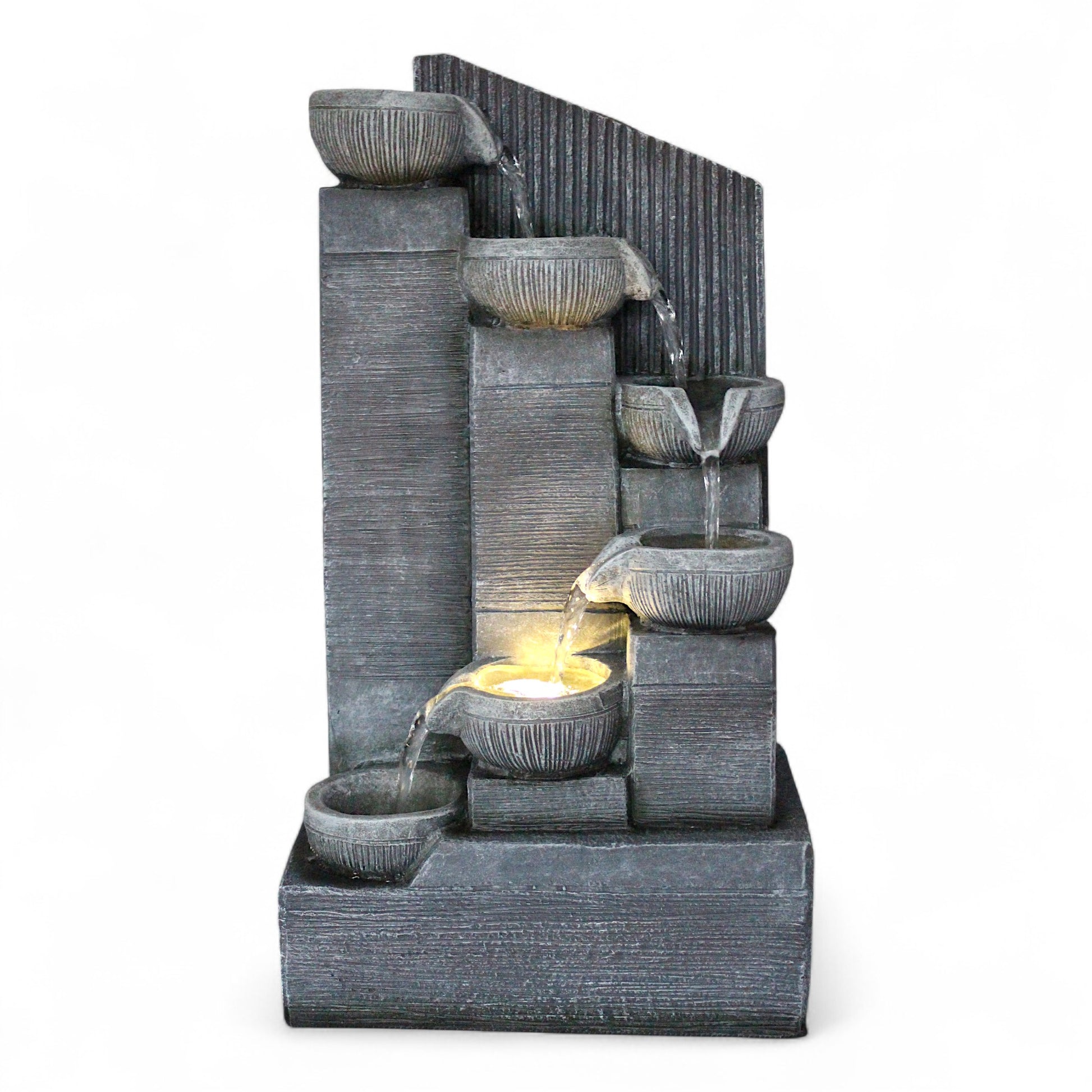 Das Wasser fließt sanft über 6 kleine Krug-Schalen (auch Kaskadenschalen genannt) Stufe für Stufe nach unten. Dies sorgt für ein entspannendes, gleichmäßiges Plätschern – ideal für Entspannung, Meditation oder als dekoratives Highlight.