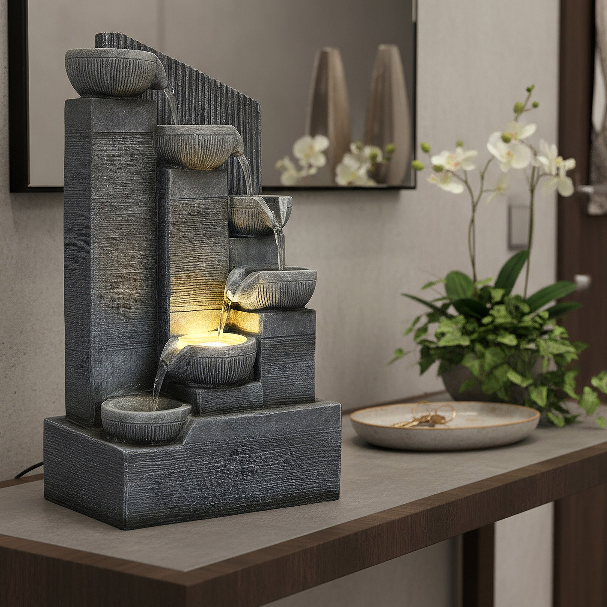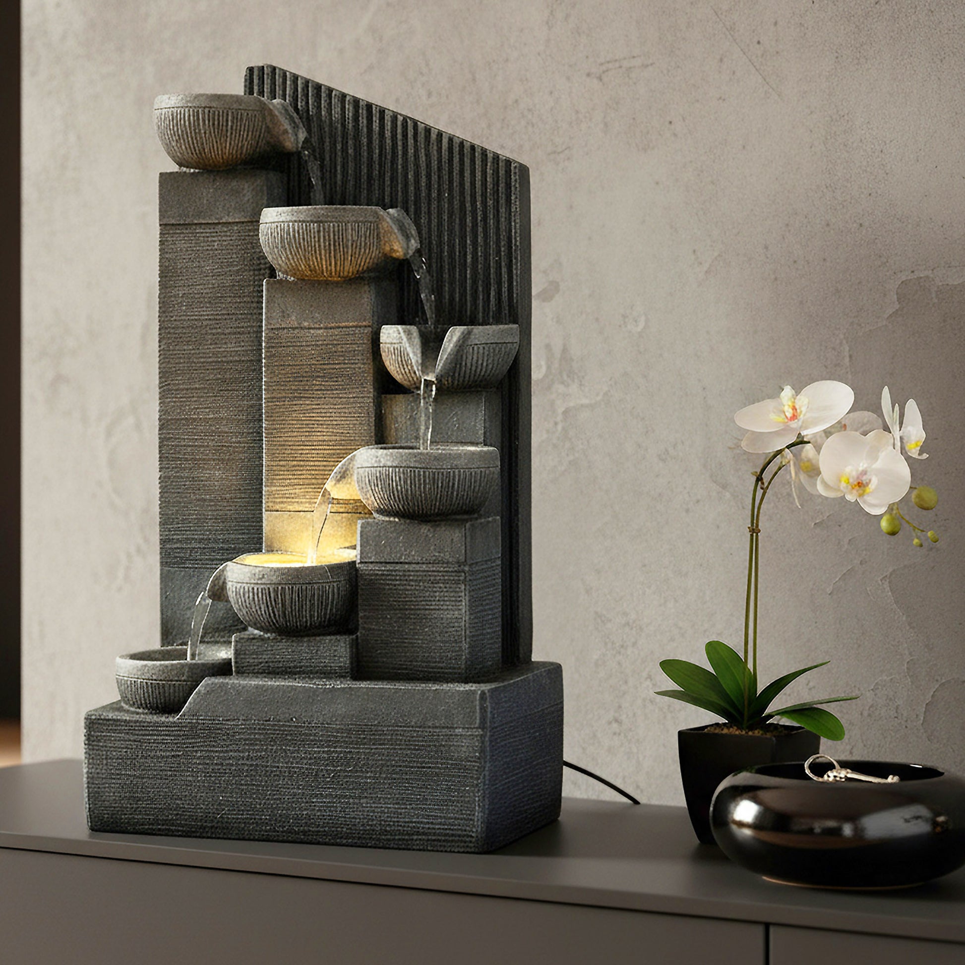 Eleganter Springbrunnen für Innen & Außen – Kompakte Größe, stimmungsvolle LED-Beleuchtung & moderner Kaskaden-Look 45 cm
